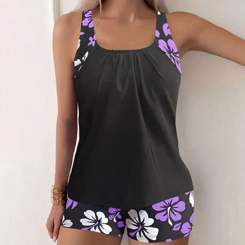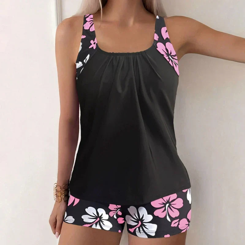 El top estampado con tirantes finos da forma a tu escote, mientras que el cómodo pantalón corto se ciñe suavemente a tus caderas, perfecto para moverte, nadar y descansar.